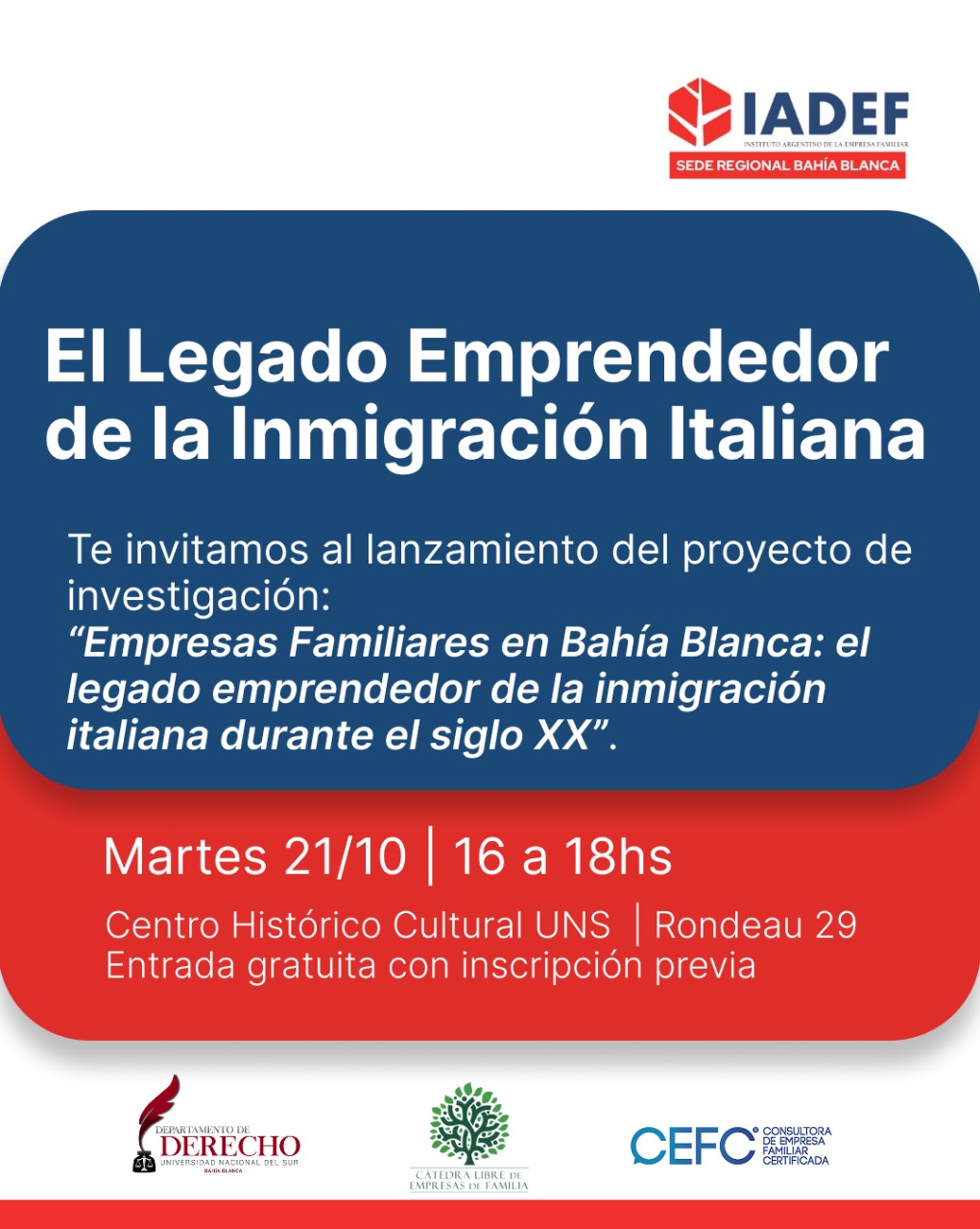 La sede regional Bahía Blanca del IADEF junto a la Cátedra Libre de Empresas de Familia y el Departamento de Derecho de la UNS, invitan a la presentación del Proyecto de Investigación: “Empresas Familiares en Bahía Blanca: el legado emprendedor de la inmigración italiana durante el siglo XX” (Prof. María Carla Tettamanti)